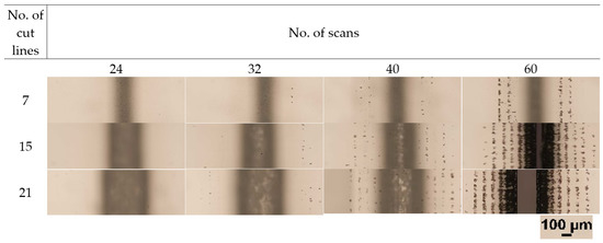 In this section, we show that the refraction from the cut sidewall was the main effect causing the band-like damage in laser-cut strips. For this, we produced additional cuts in t = 550 µm glass plates in ambient air. The depth and width of cuts were controlled by varying the number of scans (from 24 to 60) and the number of cut lines in a single scan (from 7 to 21), respectively. The hatch distance was fixed at 25 µm. The micrographs showing the back surface of glass plates after the ablation are presented in Figure 9. According to the results, the back side damage occurred after 32 scans. The damage appeared as separate dots clustering into bands. The number of bands increased with the number of scans as the damage accumulated due to repetitive laser beam scanning. Also, the number of individual spots increased and merged into continuous bands after 60 scans.
