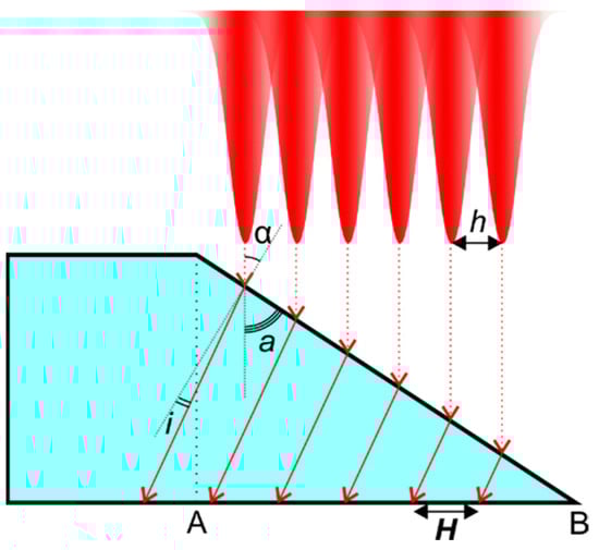 Here, H is the distance between the bands, h is the hatch, i is the laser beam refraction angle, and a is the taper angle. Snell’s law was used to determine the angle of the refraction based on the laser beam incident angle α and refraction indices of glass and ambient air (cutting environment). Furthermore, the formation of such a laser beam profile led to wavy cut sidewalls consisting of ridges and concavities, which were discussed in more detail in [35]. Therefore, the formation of concavities could act as additional focusing elements affecting the laser fluence of the refracted laser beam.