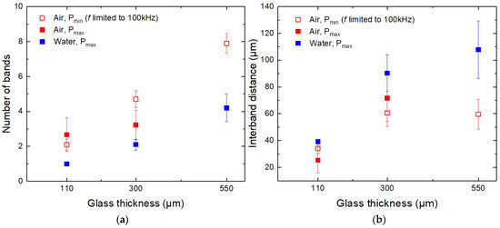 Figure 11b shows the relationship between the interband distance and the glass thickness. Here, the steepness of the cut wall (taper angle), the hatch distance, and the laser beam refraction angle determined the interband distance. In our case, steeper sidewalls obtained in water contributed to greater interband distances than in ambient air.