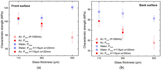 In this section, we investigated the characteristic strength of laser-cut glass strips (26 × 5 mm2) cut in ambient air and water environments. Laser-cut glass strips were broken using the four-point bending setup described in Section 2 and [35]. The front and back side characteristic strengths were evaluated. Characteristic strength measurements for glass strips with dimensions of 26 × 5 mm2 were conducted for t = 300 and 550 μm glass strips. The strength of the thinnest glass plates of t = 110 μm was evaluated by cutting and breaking wider 26 × 20 mm2 strips. The width of the strips was increased to ensure sufficient sensitivity and reliability of the breaking force measurement system by increasing the force required to break the glass strips.