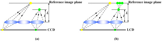 Actually, the viewed 3D image is spliced by a serious of sub-images observed through each a lens. The reference plane is the conjugate plane of the lens array. The pixels on the liquid crystal panel will be imaged on the reference plane, and the reconstruction plane is the actual depth plane of the captured 3D object. If the object is far away from the reference plane in the pickup stage, the sub-images viewed by human eye will not be spliced correctly in the display stage. This is called facet-braiding phenomenon [24,25], which results in the limited depth of field and deterioration of display quality. When the reference plane is inconsistent with the reconstructed plane, the facet-braiding phenomenon appears. As the distance between the two planes increases, the facet-braiding phenomenon becomes more obvious. According to the positional relationship between the two planes, the facet-braiding phenomenon is divided into two types. When the reconstructed plane is far away from the reference plane, the facet braiding is called direct displacement, as shown in Figure 2a. When the reconstructed plane is located between the reference plane and the lens array, the facet braiding is called inverse displacement, as shown in Figure 2b. The facet-braiding phenomenon is the decisive factor that limits the depth of field of 3D display system. Although many works have been conducted on it in recent years, there are few specific solutions for the phenomenon to improve the depth of field and display quality.