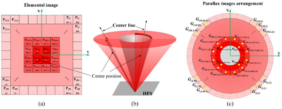 where P is the diameter of the conical lens, H represents the distance between the viewing plane and the HFS, and L represents the distance between the HFS and the conical lens array. The inner ring with φ i n n e r = 20° is constructed by the central pixels of the elemental image and the outer ring with φ outer = 35° is constructed by the edged pixels of the elemental image.
