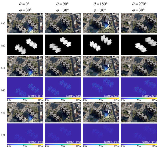 Figure 5. Simulation results: (a) Perspectives captured from different angles; (b) depth maps of different perspectives; (c) simulation results of the reconstructed image without optimized algorithm; (d) the SSIM values without optimized algorithm; (e) simulation results of the reconstructed image with proposed optimized algorithm; (f) the corresponding SSIM values with proposed optimized algorithm.