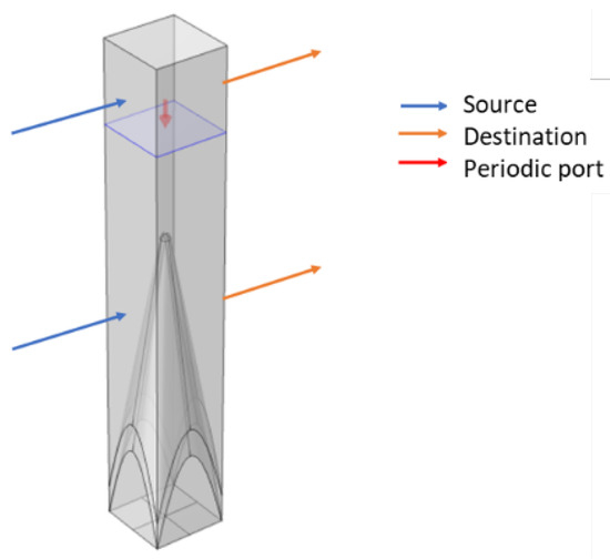 The calculation of the scattering properties of infinite periodic structures can be simplified using Floquet mode [30,31]. The paper uses a single cone as the computational unit, then applies periodic conditions for the boundaries of the single cone in the 𝑥 and 𝑦 directions, and similarly adds periodic ports above the cone. The reflection coefficient under the electromagnetic wave of a specific frequency can be obtained. As shown in Figure 3, the periodic boundary conditions in one direction only. However, the surface structure and materials of the cone model are relatively complex, making it easy to generate electromagnetic waves of different modes. Therefore, this design adds a perfect matching layer above the model to absorb electromagnetic waves of different models.