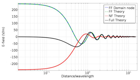 The cone array cross section is regarded as a two-dimensional antenna model. Then, the background electric field is applied to the whole geometry field and the scattering amplitude of the PML is calculated as the scattering characteristics of the cone array. This assumes that the background field is set to to determine the direction of the background electrical field. In this model, the distance between the far-field node and the center of the cone array should meet the far-field condition. As shown in Figure 6, the relationship between the electric field of the dipole is calculated using the far-field node and the distance. By comparing the four solution methods of the far-field node, full-wave theory, near-field term and far-field term, it was found that the results of the far-field node and far-field theory coincide, and with the increase in the distance from the antenna, the results of the far-field node and full-wave theory tend to be consistent. This is because far-field nodes only consider radiation. Therefore, with the increase in distance, the contributions of and can be ignored, and the consistency with the full-wave theory will be improved. At the distance of three times the wavelength, the near-field radiation component is already very small, so the distance can be set to be nearly three times the wavelength in order to calculate the far-field scattering field.