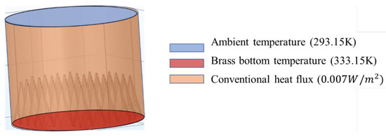 As shown in Figure 9, the surrounding metal shell is considered ideally as a generalized heat flux condition and is set to have a thermal conductivity of 0.007 . The top of the cone array is open and in direct contact with the environment, so the top is set as the natural convection model of the smoke pipe. The pipe diameter is set to a diameter of 110 mm and the pipe height is set to 100 mm to establish the cone array heat transfer model.