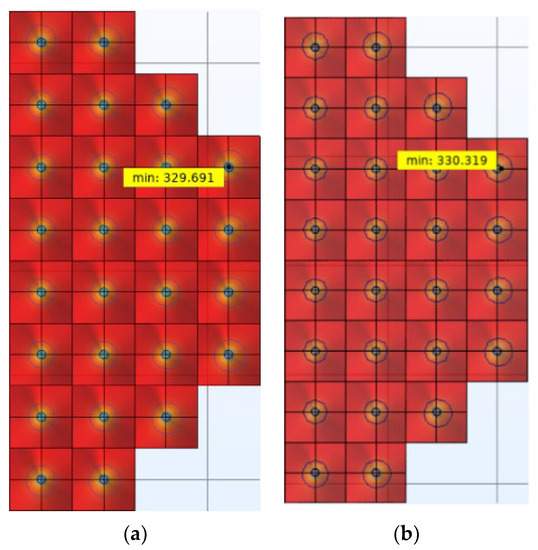 Based on the above analysis of calibration source modeling, the second-generation blackbody calibration source model was established and the index optimization was completed after the structural parameters of the first-generation blackbody calibration source model were improved. Experiments were performed to compare the simulation results of the first-generation blackbody calibration target and the second-generation blackbody calibration target. The results are shown in Figure 10 and Figure 11. In Figure 11, a yellow box labeled “min” is used to indicate the minimum temperature of the cone array surface.