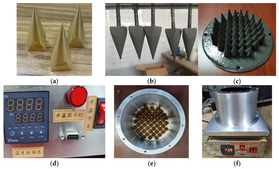 To ensure that the above performance indicators of the calibration source simulation can be achieved, the engineering prototype of the calibration source needs to be precision machined. The main components of the prototype are described according to the processing process of the blackbody calibration source. As shown in Figure 15a, the brass matrix forms the cone array. Figure 15b shows the coated cone, whose surface is made of domestic P-0001 microwave-absorbing material with a density of 4.2 g/cm3 with an attenuation of −35 dB/cm at 10 GHz frequency. During coating, the coating and curing agent is mixed at a ratio of 100:3.5, and then the cone surface is painted and cured several times to reach the required coating thickness. Next, the coated cone is placed in an oven at 120 °C for 20 min to achieve full curing. Figure 15c coated cone array. The coated cone is fixed on the bottom plate of the thermal insulation chamber with M4 screws, and the array layout is designed according to the simulation. Figure 15d shows the temperature controller AI-516PD2G. The internal temperature-control algorithm is implemented using the BP-PID algorithm. The relevant parameters of the algorithm are set through the serial port command protocol. The measurement range is 0–1300 °C, the resolution is 0.1 °C, the maximum allowable error is 3.9 °C and the accuracy class is 0.3 °C. Figure 15e shows the calibration source cavity structure. The outer side of the cavity is surrounded by thermal insulation materials. The shell is made of 6061 aluminum alloy. The entire cavity is fixed on the temperature-equalizing plate of the thermostatic heating table with screws, so as to realize the temperature control of the cone array coated in the cavity. Figure 15f shows the complete blackbody calibration source.