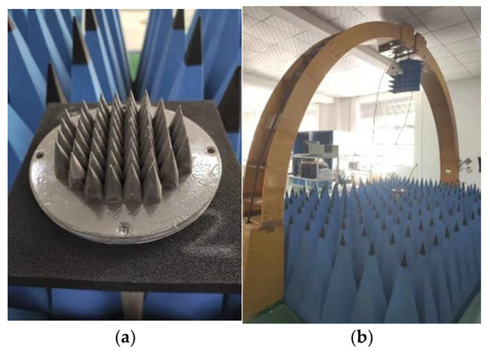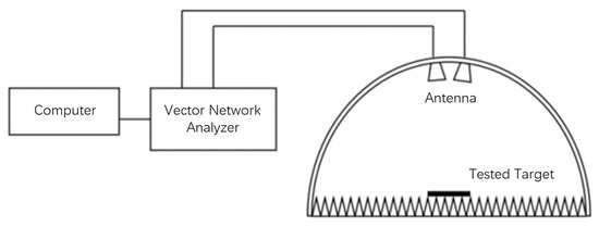 The arch test system is used to locate the transmitting and receiving antennas, so that the maximum gain direction of the transmitting and receiving antennas always points to the tested sample. In addition, the absorbing material is laid on the arch frame ground. The steps to follow when using the arch test system for testing include: (1) Select the antenna with the same frequency (one transmitting antenna and one receiving antenna), and connect the antenna with the port of the vector network analyzer using high-performance test cables; (2) Install the antenna on the arch frame to ensure that the two antennas are aligned, and raise them to the top of the arch frame; (3) Place the pyramidal absorbing material on the test bench; (4) Set the frequency band of the network analyzer. Then select the S11 parameters for testing and reset the test parameters to zero; (5) Place the tested blackbody calibration on the metal plate and record the parameters.