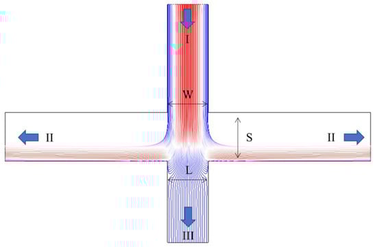 The particles enter the interior of the VI through an accelerating jet (I), the fine particles follow the fluid motion to the major flow outlet (II), and the relatively large particles maintain a linear motion due to their own inertia to the minor flow outlet (III). The acceleration nozzle width (W), the minor flow channel width (L), and the distance from the jet to the plate (S) are the key parameters for designing the VI. Since the VI can be used as an aerosol particle separator, its performance is evaluated using the collection efficiency (CE) and wall loss (WL). CE is defined as the ratio of the number of particles exiting the major flow to the sum of the number of particles exiting the major flow and the minor flow, and WL is defined as the ratio of the number of particles lost inside the VI to the number of inlet particles []. The equations for CE and WL are shown below.