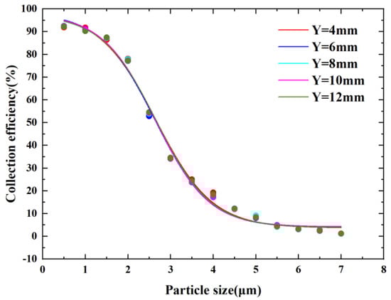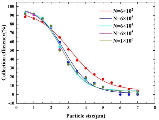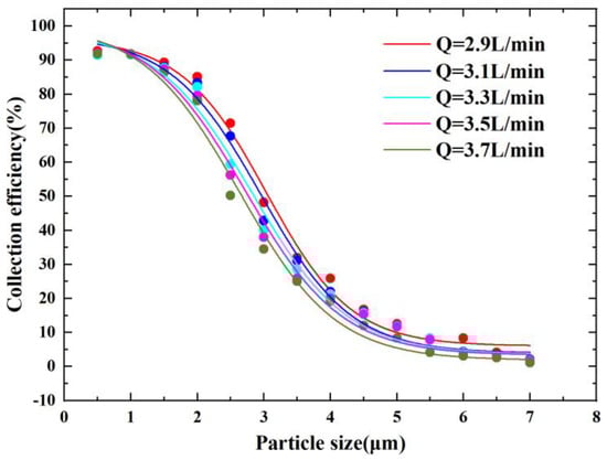 Figure 7 shows the CE curves for different inlet flow conditions. It can be observed that the cutoff diameter decreased as the flow rate increased, which is consistent with the correlation reflected in the Stokes number equation. The results showed that for the present model configuration, the Stokes number of the cutoff diameter corresponded to around 0.7 for different flow rates. The cutoff diameter was 2.5 µm when the flow rate Q was equal to 3.7 L/min, and the final choice of inlet flow rate Q was 3.7 L/min when the corresponding was 0.74.