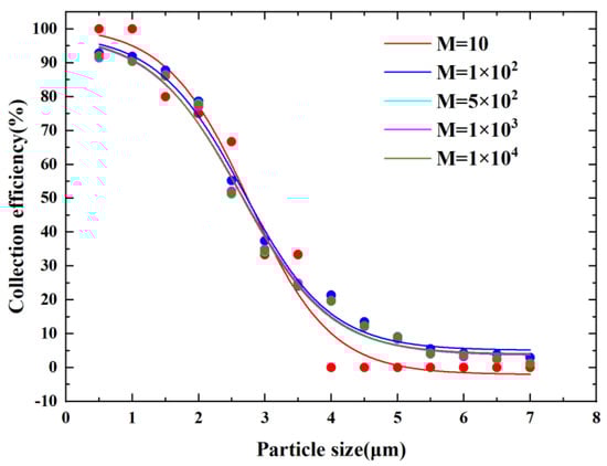We then verified the irrelevance of the number of inlet particles. In Figure 3, M indicates the number of inlet particles released. From Figure 3, it can be observed that the CE curves tended to be consistent as the number of inlet particles increased. When M was larger than , the CE curve hardly changed. We ultimately selected the number of entrance particles M equal to in consideration of the fact that an increase in the number of particles released increases operation time.