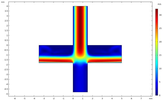 Figure 5 shows the velocity distribution of the VI at an inlet flow rate of 2.9 L/min and a splitting ratio of 10%. It was observed that the VI velocity field was symmetrically distributed and the major channel velocity was higher than the minor channel velocity. Since the splitting ratio was relatively small, the flow velocity of the minor flow channel was lower, which is conducive to the inertial separation of particles. When the flow velocity of the gas was faster, the smaller particles were more likely to follow the flow into the major flow channel; this result is consistent with our expectations.