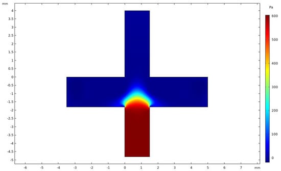 Figure 6 shows the pressure distribution for the VI. It was observed that the pressure in the minor flow channel was considerably higher than that in the major flow channel, with a good pressure difference between the channels. The differential pressure was used to control the split ratio to maintain a ratio of 9:1, such that the flow distribution reduced wall loss.