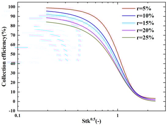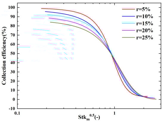 At the same time, we found that it was not possible to scale all the CE curves into one curve when changing the splitting ratio using . This is because the splitting ratio is not considered as a parameter in the Stokes number formula. This means that it is not possible to predict the cutoff diameter for different splitting ratios from the Stokes number. Thus, we proposed a modified Stokes number formula () that introduces the splitting ratio into the consideration of the Stoke number formula as shown in Equation (4).