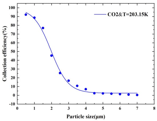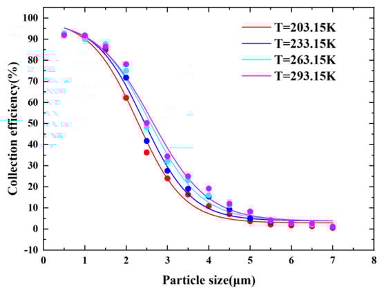 Here, is equal to and B is a constant related to the gas type. From Equation (6), we can see that temperature and fluid dynamic viscosity are positively correlated, and according to the Stokes number, dynamic viscosity is positively correlated with the cutoff diameter. We can therefore reduce the cutoff diameter by decreasing the temperature. Figure 11 shows the plots of CE curves at different temperatures. As shown in Figure 11, there was a positive correlation between the temperature and the cutoff diameter, and the steepness of the CE curve was improved when the temperature decreased. When the temperature decreased from 293.15 K to 203.15 K, the cutoff diameter decreased from 2.5 µm to 2.05 µm, which was a decrease of about 18%. At the same time, the decrease in temperature weakened the particle Brownian motion phenomenon, which reduced the probability of particle wall loss due to Brownian motion and contributed to the improvement of VI performance.