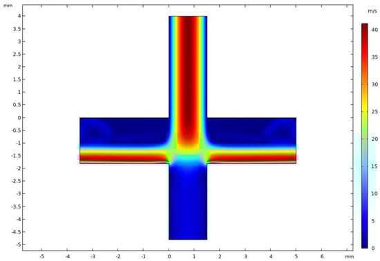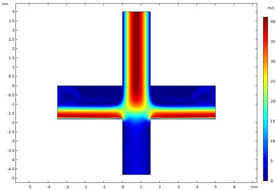 Figure 12 and Figure 13 show the velocity and pressure distributions of the VI when CO2 was used as a fluid. From Figure 12 and Figure 13, it can be observed that the velocity field of the VI did not change when CO2 was used as a fluid. The velocity was still symmetrically distributed, and the flow velocity in the major flow channel was higher than that in the minor flow channel while the pressure on the minor flow channel of the VI increased, which was convenient for controlling the splitting ratio to maintain the low wall loss range.