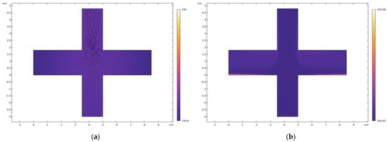 (a) Temperature distribution of VI at 1 s for the transient solver; (b) temperature distribution after stabilization of VI obtained by the steady-state solver.