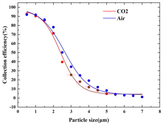 Figure 15 shows the CE curves when either CO2 or air was used as the fluid. As can be seen in Figure 15, the cutoff diameter of VI when CO2 was used as the fluid was smaller than that when air was used as the fluid. The cutoff diameter was reduced from 2.5 µm to 2.15 µm, which was a 14% reduction. This is because the kinetic viscosity of CO2 is lower than that of air, which has the effect of reducing the kinetic viscosity, thus reducing the cutoff diameter.