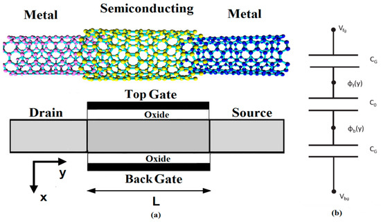 where acc is the distance between adjacent carbon atoms, t is the hopping energy and T is the temperature. Using the common Poisson’s equation the potential distribution, , for any point (x,y) of channel is given by [33,39,40,41]