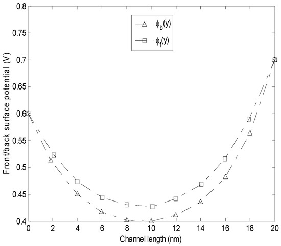 The following parameters are used in the analytical modeling: tox = 1 nm, tch = 1.2 nm, ND = 1 1018 cm−3, ni = 5 1016 cm−3, L = 20 nm, while the flat band and gate voltages of the front and back sides are variable. The surface potential of front and back gates as a function of channel length is shown in Figure 3. Apparently, the surface potential value of front gate is higher than that of back side. It is noteworthy that channel length affects the position of minimum surface potential.