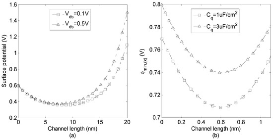 (a) Surface potential along the channel distance for unequal flat band/gate voltages of the front and back sides (Vfg = 0.1 V, Vbg = 0.2 V, Vfb-f = 0.1 V, Vfb-b = 0.2 V), (b) the minimum potential along the channel for different values of quantum capacitance (Vfg = Vbg = 0.4 V).