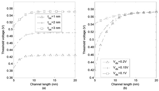 The effect of gate-oxide thickness on threshold voltage versus channel length is illustrated in Figure 5a. Apparently, threshold voltage increases by increased oxide thickness. This is because of the fact that gate-oxide electric field increases as oxide thickness decreases. The variation of threshold voltage along the channel for different drain–source voltages is plotted in Figure 5b. It can be seen that the threshold voltage reduces as the voltage increases. It is noteworthy that the effect of drain–source voltage is more significant for the source side of the channel.