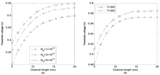 The doping concentration effect on the threshold voltage is indicated in Figure 6a. It seems that, as the concentration increases the threshold voltage also increases. This is due to the fact that source–channel barrier increases by increasing doping concentration which results in threshold voltage increment. It is also revealed that threshold voltage increases as channel length increases because of the increment in the electric field effect on the depletion regions of source and drain junctions. Figure 6b shows the threshold voltage along the channel for two different temperatures. The profile of voltage is the same for both values of temperature, in which the threshold voltage increases as the temperature increases.