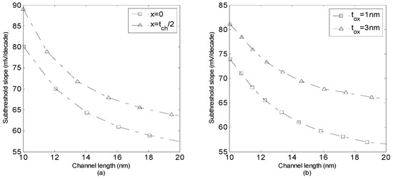 Figure 7a illustrates subthreshold slope versus channel length for two cases x = 0 and x = tch/2 with L varying from 10 to 20 nm. The values of the subthreshold slope demonstrate a better top gate control on the front side of the channel. It is observable that the subthreshold slope gets closer to the ideal value of 60 mV/dec as the channel length increases. The obtained result of subthreshold slope resembles the better gate control on the GNS channel. However, the subthreshold slope increases for the shorter channel length devices. The effect of oxide thickness on the subthreshold slope is investigated in Figure 7b. Apparently, as oxide thickness increases the subthreshold slope also increases. For thinner gate oxide, the gate capacitance is larger while the gate has better control over the channel. Furthermore, for the thinner tox and shorter channel devices, the subthreshold slope degradation is mainly a result of the direct source to drain tunneling. On the other hand, as the quantum capacitance is in series with Cox, the overall gate capacitance becomes smaller than Cox. Therefore, the gate control over the channel declines for larger values of Cq and the subthreshold increases. It is also observed that subthreshold slope decreases as channel length increases.