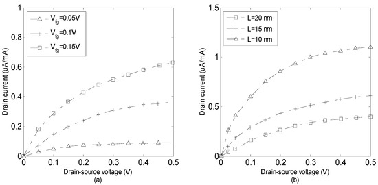 The current–voltage characteristics of the device are presented in Figure 8a,b. Figure 8a points out strong gate–source voltage dependence of the I–V characteristic showing that the drain current increases as the gate voltage increases. In other words, a greater value of drain current results as front gate voltage increases from 0.05 to 0.15 V. This is because of the fact that the voltage drops through the oxide close to the drain terminal reduces as the drain voltage rises. As a result, the induced inversion charge density close to the drain also decreases. The effect of the channel length scaling on the I–V characteristic is investigated in Figure 8b. Apparently, the drain current rises substantially as the channel length decreases from 20 to 10 nm. It is notable that the scaling of the channel length improves the gate electrostatic control, creating larger transconductance and smaller subthreshold swings.