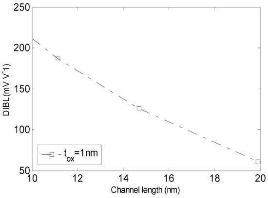It is noteworthy that the minimum value of surface potential and its location are dependent on the drain voltage which is a sign of DIBL. The variation of DIBL as a function of channel length is illustrated in Figure 9. It can be seen that the profile of DIBL decreases as channel length increases. It can be also observed that by shrinking the channel length below 20 nm, the DIBL effect becomes more severe. To define the physical phenomena related to the result shown in Figure 9, note that as channel length becomes shorter the depletion region increases which produces a big surface potential that decreases the barrier height and the DIBL effect becomes more severe.