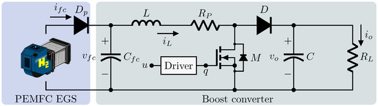 This section describes the analysis, physical assumptions, and methods to obtain a representation of the system under study. As depicted in Figure 1, the fuel cell system is formed by a PEMFC EGS feeding a purely resistive load through a DC–DC boost converter as the interface. The components are an EGS, a fully automated fuel cell stack with a rated output power of about 1.2 kW at 24 V; the diode , that prevents reverse current flow to the PEMFC; the coupling capacitor , the input inductor L; the MOSFET transistor M; the output capacitor C; the load , which is considered purely resistive; and the parasitic resistance of the inductance that is taken into account to increase the accuracy of the model. The currents , , and are the fuel cell, inductor, and output average currents, respectively. The voltages and are the PEMFC and converter output voltage, respectively, and u is the duty cycle to generate the PWM trigger signal q.