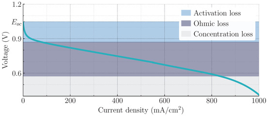 where is the open-circuit voltage (also called reversible or Nernst voltage), is the activation voltage loss that represents the slowness of the electrode surface reactions, is the ohmic voltage loss that represents the resistance to the flow of electrons and ions, and is the voltage concentration loss that represents the reduction in the concentration of the reactants at the surface of the electrodes [1,4,36]. For instance, in Figure 2, the relationship between the output voltage and current density is shown. Note that decays (in a nonlinear manner) below the when the demanded current density increases.
