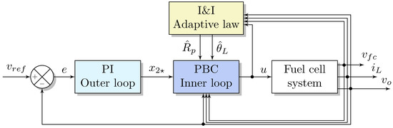 In this paper, an adaptive multi-loop PBC technique for regulating the output voltage of a fuel cell/boost converter system is described and assessed using real-time numerical results. The proposed approach is adaptive because the inductor and load resistances are approximated using an immersion and invariance adaptation law, and consequently the robustness of the overall control scheme is increased by applying these approximations in a certainty-equivalent manner. Furthermore, the inner control loop was developed using standard PBC to ensure accurate tracking of the current reference, which in turn is generated by the outer control loop based on a PI action in order to ensure output voltage regulation. Due to the integration of both loops, the only requirement for implementing the proposed controller is to satisfy a non-conservative constraint on the proportional gain of the outer loop, which is dependent on the physical considerations of the system. Real-time numerical results have demonstrated exact voltage regulation, current tracking, and robust behavior regardless of fuel cell voltage fluctuations, abrupt load, and voltage reference changes. Because the computational burden of the control is low, the technical feasibility of the proposed controller is assured with a 50 s time step using a DSPACE 1104 data acquisition platform; therefore, an experimental setup can be implemented without any issue. Finally, future research contemplates the following directions: experimental validation of the control laws obtained with a laboratory prototype, and its comparison with other controllers through performance indices. Additionally, hybridization of the fuel cell system with energy storage systems is considered as well, in order to improve the dynamic response.