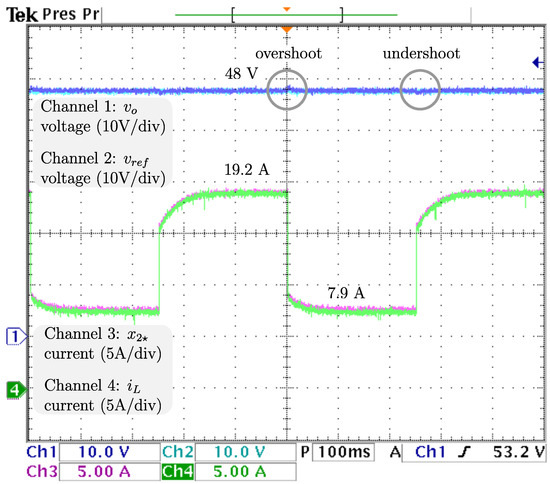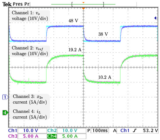 Real -time results for sudden load changes. From top to bottom: , the output voltage; , the reference voltage; , the inductor current reference; and , the inductor current.