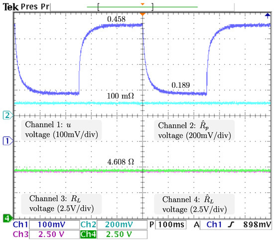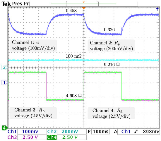 Real -time results for sudden load voltage changes. From top to bottom: u, the control signal; , the estimation of the parasite resistance; , the load; and , the estimation of the load through its conductance.