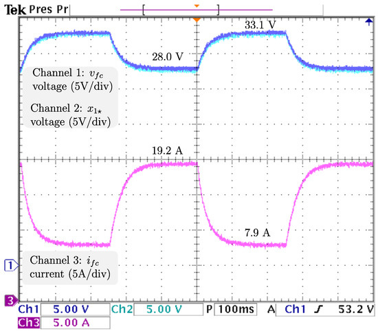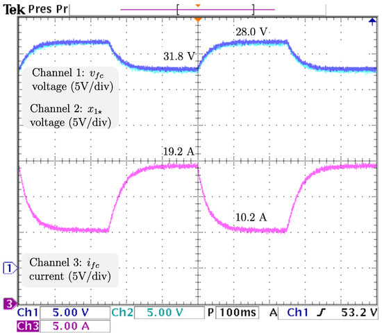 Real-time results for sudden output voltage changes. From top to bottom: , the fuel cell voltage; , the fuel cell voltage reference; and , the fuel cell current.