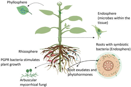 An overview of plant growth-promoting microbes that reside in the rhizosphere, endosphere, and phyllosphere regions.