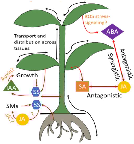 The plant produces signaling hormones or phytohormones that include salicylic acid (SA), jasmonic acid (JA), ethylene (ET), abscisic acid (ABA), and auxins (such as indole-3-acetic acid (IAA)). The phytohormone signals are generated in the infected tissue and then circulated throughout the plant via the xylem and phloem. A progressive variation in the phytohormone levels serves as an early signal of plant stress [34,35,36]. Figure 2 shows a simplified model of the phytohormone dynamics in response to a stress condition [37]. SA, JA, ABA, and IAA are among the most important regulators of induced defense mechanisms [33,36,38,39,40,41,42,43]. Progressive variations in their levels have been reported in response to abiotic stressors including drought, salt, and cold/heat conditions [43,44,45,46] as well as biotic stressors including pathogen infection [47,48]. Exogenous application of these hormones is found to mitigate oxidative stress in plants [46,49,50,51,52,53,54,55]. Oxidative stress occurs due to a burst of reactive oxygen species, which are triggered by biotic (attack by microbes, pests, herbivores) and abiotic (drought/floods, temperature variations, soil nutrient/salinity/pH deficiencies) stresses. Root exudates are another form of signaling molecules that mediate the communication of plants with the rhizosphere. Root exudates are primarily composed of sugars, amino acids, organic acids, and vitamins, serving as a rich source of nutrients for the microbial community [56]. These exudates serve as carbon and energy sources for microorganisms living in the rhizosphere, while also profoundly influencing the composition and diversity of the microbial community [57]. Plants release the majority of photosynthates (the products of photosynthesis) into the rhizosphere through roots. Plants also release 100 teragrams (Tg) of methanol and 530 teragrams (Tg) of isoprene each year [58,59]. The interconnected signaling pathways of the compounds secreted from plants are central to the plant’s ability to fine-tune the rhizosphere’s microbiome structure or the induction of defenses in response to stressors. This section describes the various signaling molecules that mediate plant-microbial interactions.