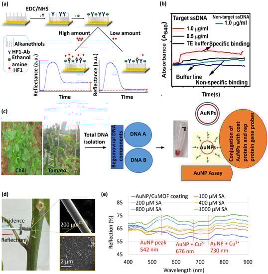Attenuated total reflection (ATR)-based sensors utilize evanescent wave absorption techniques for real-time detection of biomolecules [161,162,163,164]. In this regard, an ATR platform was modified to LSPR to detect the single-stranded DNA (ssDNA) of the chili leaf curl virus (ChiLCV; Genus: Begomovirus, Family: Geminiviridae) [165]. The amine-functionalized surface was immobilized with gold nanoparticles to generate LSPR. Figure 3b shows the dynamic variations in absorbance due to specific (viral ssDNA) and non-specific (healthy ssDNA) binding to the LSPR probes. The proposed ATR-LSPR platform exhibited a detection limit of 1 µg/mL for the ChiLCV DNA. Lavanya and Arun [166] reported a colorimetric LSPR assay for early detection of Begomovirus in chili and tomato plants Total DNA was isolated from the plant samples and subsequently analyzed by the LSPR assay, as schematically illustrated in Figure 3c. The assay was able to detect up to 500 ag/µL of begomoviral DNA. (pTZCCPp3, a clone carrying partial coat protein gene).