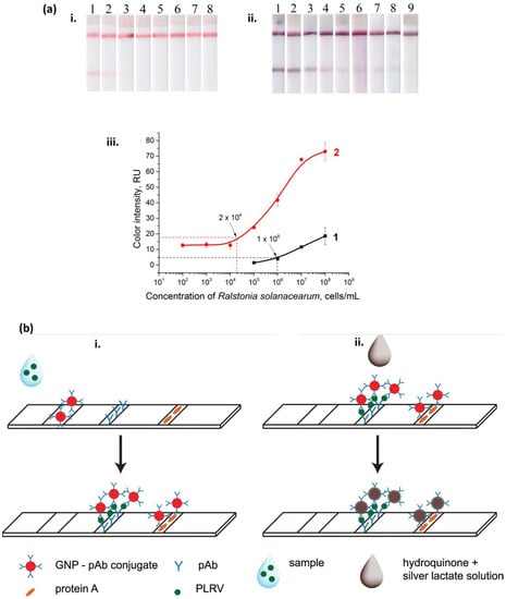 Razo et al. [178] reported a sensitive LFIA by enlarging gold nanoparticles’ size to detect Ralstonia solanacearum, which causes potato brown rot. The gold enhancement approach resulted in a lower detection limit of 3 × 104 cells/mL (Figure 5a) in the potato tuber extract and a combined assay preparation and detection time of only 15 min. The improved performance could be attributed to the catalytic properties of gold nanoparticles. Silver enhancement can be used to detect potato leafroll virus (PLRV) with high sensitivity [179]. A substantial signal enhancement was observed owing to the reduction in silver ions on the surface of gold nanoparticles. The enhancement took place due to the addition of a drop of silver lactate and hydroquinone mixture. Figure 5b shows a comparative demonstration of LFIA in conventional sandwich format (i) versus silver-enhanced sandwich format (ii).