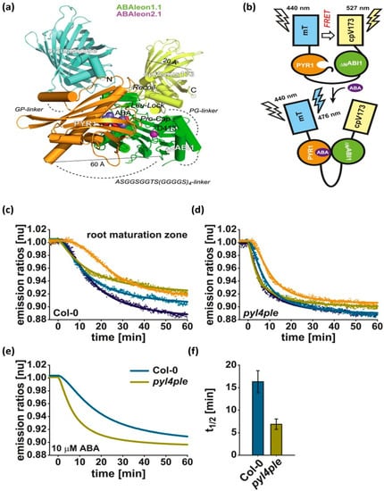 (a) Structural features of ABAleon, where mTurquoise (mT) (cyan color) is fused to PYR1 (gold color) and ΔNABI1 (green color) is fused to cpVenus173 (cpV173) (yellow color). (b) FRET from mT to cpV173 without ABA and FRET quenching with ABA. ABA response curves of (c) Columbia-0 wild type and (d) pyl4ple. (e) Data from four single measurements were fitted by a four-parameter logistic curve to obtain the combined dataset. (f) The t1/2 values calculated from the fitted curves in (c,d) [194] Copyright © eLifeSciences, Waadt et al.