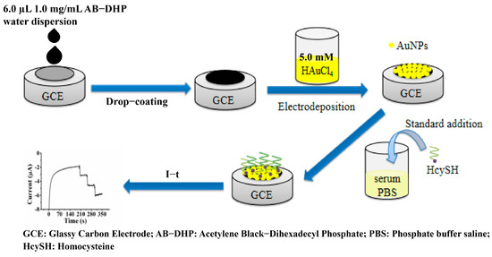 Preparation of AuNPs/AB–DHP/GCE: Firstly, a bare glassy carbon electrode (GCE) was polished on 50 nm Al2O3 slurry and sonicated in 8.0 mmol/L (mM) HNO3 aqueous solution, ethanol and ultrapure water for 2 min, separately. Then, 6.0 µL 1.0 mg/mL AB–DHP aqueous dispersion was dropped on the surface of GCE and dried under infrared light to fabricate AB–DHP/GCE. Finally, Au nanoparticles were modified on the surface of AB–DHP/GCE through cyclic voltametric scanning of AB–DHP/GCE in 5.0 mM HAuCl4 aqueous solution from 0 V to 1.5 V at a scan rate of 100 mV/s for 25 cycles. The AuNPs/AB–DHP/GCE was obtained for use as a HcySH electrochemical sensor. The schematic diagram of the sensor preparation process is shown in Figure 1.