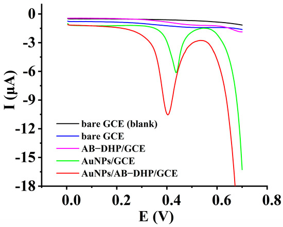 To ensure the electrocatalytic response of the AuNPs/AB–DHP nanocomposite film to the oxidation of HcySH, the electrochemical behavior of HcySH on different electrodes was collected through differential pulse voltammetry, which is shown in Figure 2. When there was no HcySH in the supporting electrolyte, no electrochemical response appeared (black line). When there was 200 µM HcySH in the supporting electrolyte, no obvious electrochemical response was observed on the bare GCE (blue line), and only a weak oxidation peak (Ep = 0.51 V, Ip = 0.17 µA) was observed on AB–DHP/GCE (purple line). On AuNPs/GCE (green line), a sharp oxidation peak (Ep = 0.46 V, Ip = 4.7 µA) appeared, and a better oxidation peak (Ep = 0.4 V, Ip = 8.3 µA) was obtained on AuNPs/AB–DHP/GCE (red line). The results indicated that the AuNPs/AB–DHP/GCE showed an obvious electrocatalytic response to the oxidation of HcySH, which may be attributed to the large specific surface area of the AB, the good conductivity of the AuNPs and the affinity of the AuNPs to HcySH through the Au-S bond.