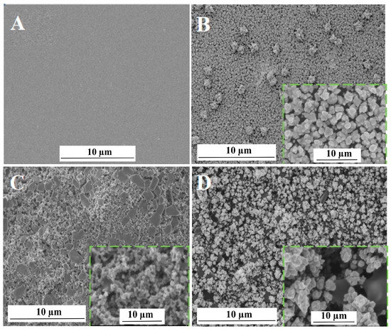 The surface topography of different electrodes was characterized with the aid of scanning electron microscopy (SEM), and the results are shown in Figure 3. As seen in Figure 3A, the surface of the bare GCE was clear and smooth. On the surface of AuNPs/GCE, a large quantity of AuNPs was observed (Figure 3B). The AB–DHP film presented a compact block structure on the surface of the AB–DHP/GCE (Figure 3C). After electrodepositing the AuNPs on the surface of the AB–DHP/GCE, the entire electrode surface loosened (Figure 3D), and many AuNPs were attached on the surface of the porous AB. The nano-effect of the AuNPs, together with the relaxed and porous structure of the AB, increased the specific surface area of the electrode effectively, which was conducive to the enrichment of HcySH and, thereby, significantly improved the detection sensitivity of the sensor.