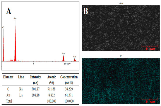 Energy dispersive X-ray spectrum analysis was used to further confirm the successful addition of the AuNPs and the AB–DHP nanocomposite film, and the result is shown in Figure 4. Obviously, the elements present on the surface of the AuNPs/AB–DHP/GCE were C and Au (Figure 4A). The main source of the C was the AB and the glassy carbon. The Au was mainly derived from the AuNPs. Figure 4B shows the distribution map of the Au and the C on the surface of the electrode. In the figure, the white represents the Au, and the blue represents the C. It can be seen that the Au and the C were uniformly and widely distributed on the electrode surface, which showed that the AuNPs/AB–DHP composite film was successfully added to the surface of the GCE.