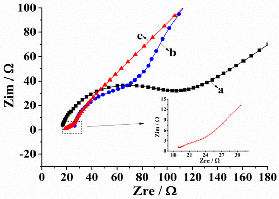 With the aid of the electrochemical impedance spectrum (EIS), the impedance state of the electrode surface was characterized, and the corresponding Nyquist diagram is shown in Figure 5. A typical impedance spectrum includes a semicircular part at a higher frequency and a linear part at a lower frequency. The former corresponds to the charge transfer process on the electrode interface; moreover, the diameter of the semicircle is proportional to the impedance of the electron transfer during the electrode reaction. The latter corresponds to the diffusion process of the reactant or the results of the electrode reaction [28]. It can be seen in Figure 5 that the electrochemical impedance spectroscopy of the AuNPs/AB–DHP/GCE has the smallest semicircular diameter, which means that, as compared to the bare GCE (a) and the AB–DHP/GCE (b), the AuNPs/AB–DHP/GCE (c) had the smallest interface resistance. Therefore, it accelerated the electron transfer rate between the HcySH and the electrode more effectively, indicating the sensor had a short response time.