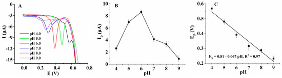 (A) Differential pulse voltammograms of 200 μM HcySH on AuNPs/AB–DHP/GCE in 0.15 M PBS with different pH values. (B) Linear relationship between the oxidation peak current of HcySH and the pH value. (C) Linear relationship between the oxidation peak potential of HcySH and the pH value.