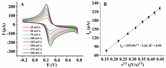 With Fe(CN)63−/4− as the probe, the effective area of the nanocomposite film-modified electrode was measured by cyclic voltammetry (Figure 8A). Figure 8B shows that the peak currents (Ip) had a good linear relationship with v1/2 at a temperature of 25 °C. According to the Randles–Sevcik [32] equation (Equation (2)), the values of the effective surface area (A, cm2) were calculated.