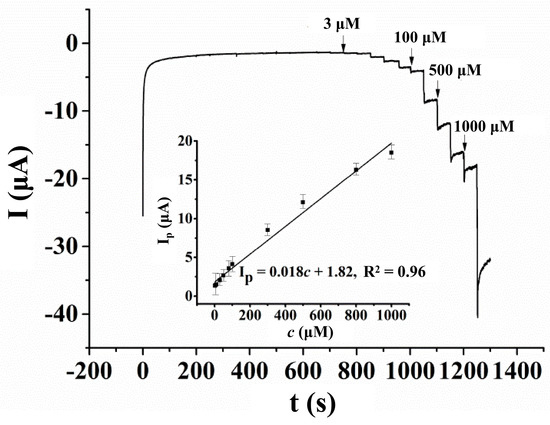 Amperometric measurements were carried out to investigate the linear range of the sensor, and the result is shown in Figure 10. From 200 s to 1250 s, different volumes of the HcySH standard solution were injected into the supporting electrolyte every 50 s. However, from 200 s to 650 s, no obvious electrochemical response was observed due to the low concentration of HcySH in the supporting electrolyte. From 700 s to 1200 s, after the injection of the HcySH standard solution, the concentrations of HcySH in the supporting electrolyte were 3 μM, 6 μM, 10 μM, 30 μM, 50 μM, 70 μM, 100 μM, 300 μM, 500 μM, 700 μM and 1000 μM. The inset of Figure 10 shows the good linear relationship of the oxidation peak current of HcySH on the AuNPs/AB–DHP/GCE, and its concentrations were in the range of 3 μM−1000 μM. The linear equation is: Ip(μA) = 0.018 c(μM) + 1.82, R2 = 0.96. According to the slope of the linear equation, the sensitivity of the sensor was 18 nA/μM. Assuming that the signal-to-noise ratio was equal to 3, as is the standard, the detection limit of the sensor was measured at 0.6 μM, and the response time was 3 s.